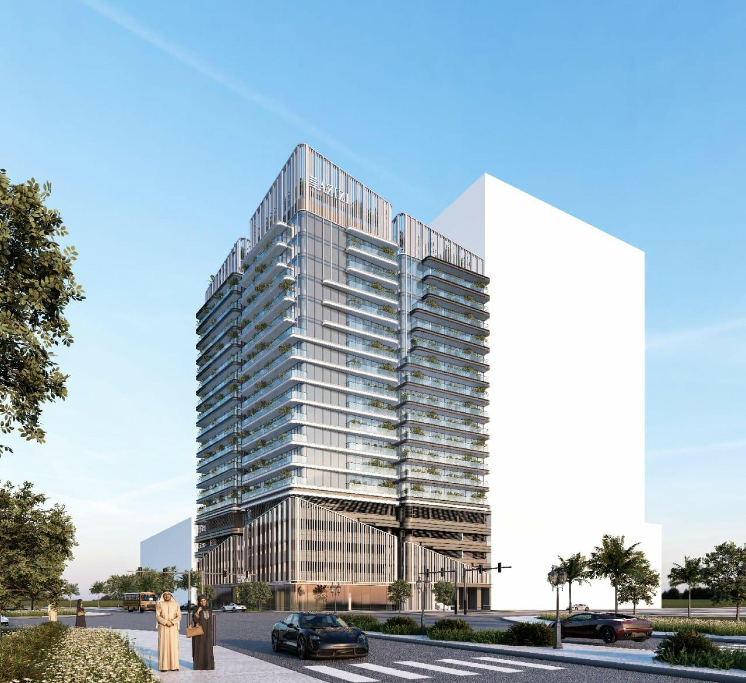 * Azizi Ruby es una torre residencial de mediana altura de aproximadamente 13 plantas (con tres sótanos, planta baja, cuatro niveles de podio, plantas residenciales y servicios en la azotea y el podio).