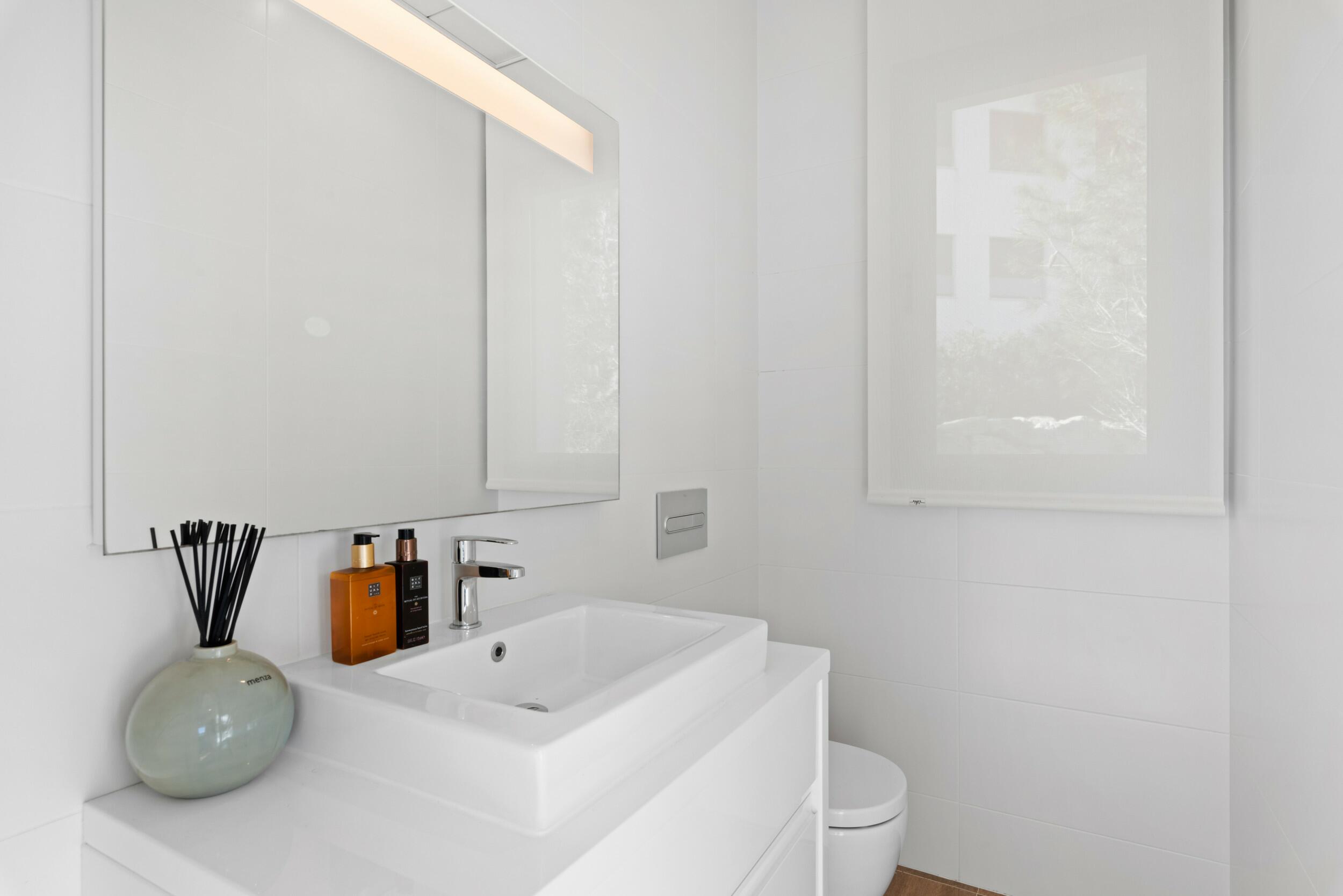 En la planta principal, encontrará una espaciosa suite principal con baño privado, un aseo de invitados y una zona de estar y comedor de planta abierta con una cocina de diseño. Grandes ventanales conectan a la perfección el interior con la amplia terraza de la piscina, donde varias zonas para sentarse y una piscina climatizada invitan a disfrutar del estilo de vida mediterráneo durante todo el año.